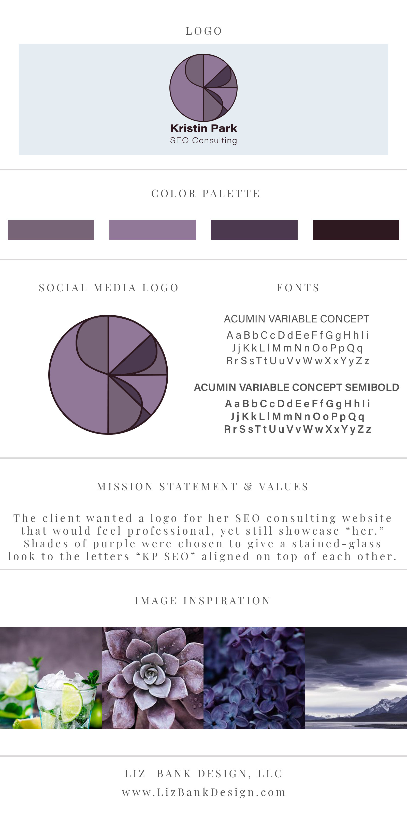 The client was looking to create a website and branding for her freelance Search Engine Optimization (SEO) consultation business. Her requirements were "purple." We narrowed down some shades of purple, as well as some ideal customer user profiles
